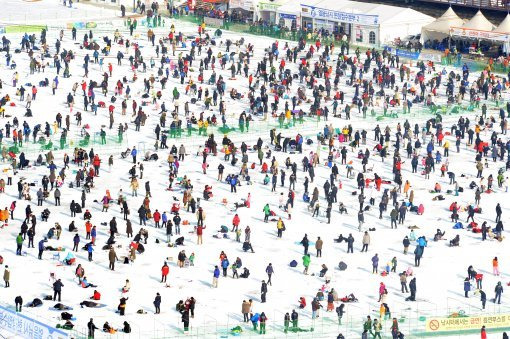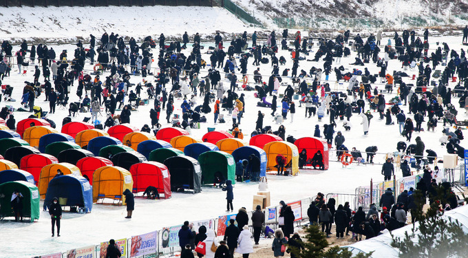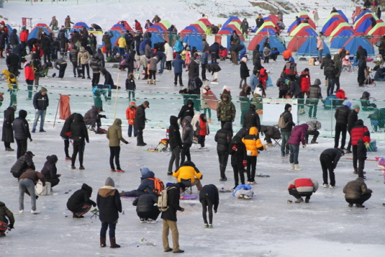 낚시 외에도 눈썰매, 얼음자전거 등 다양한 놀이기구를 즐길 수 있습니다. - 먹거리촌 활용하기